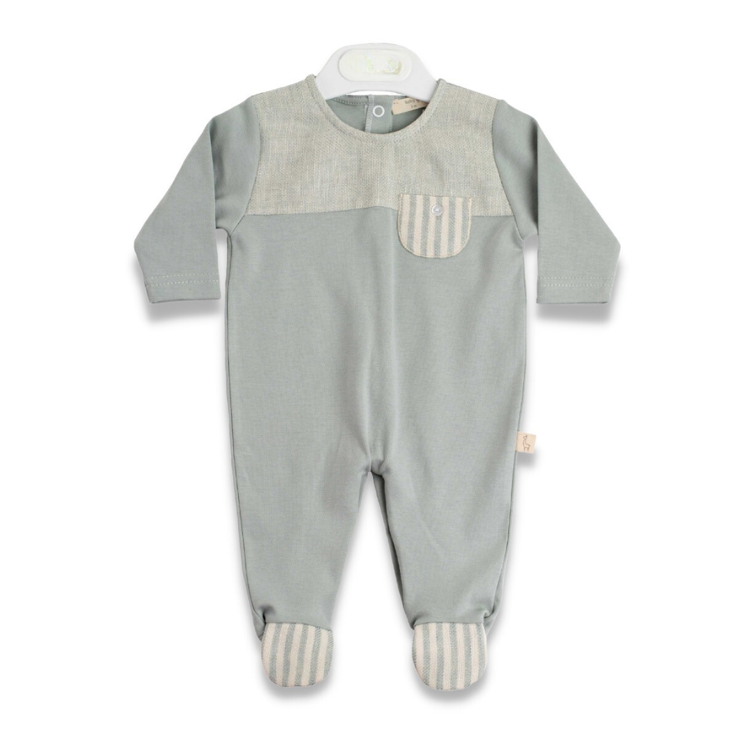- Cozy light teal long sleeve footie featuring an adorable striped pocket for added style.