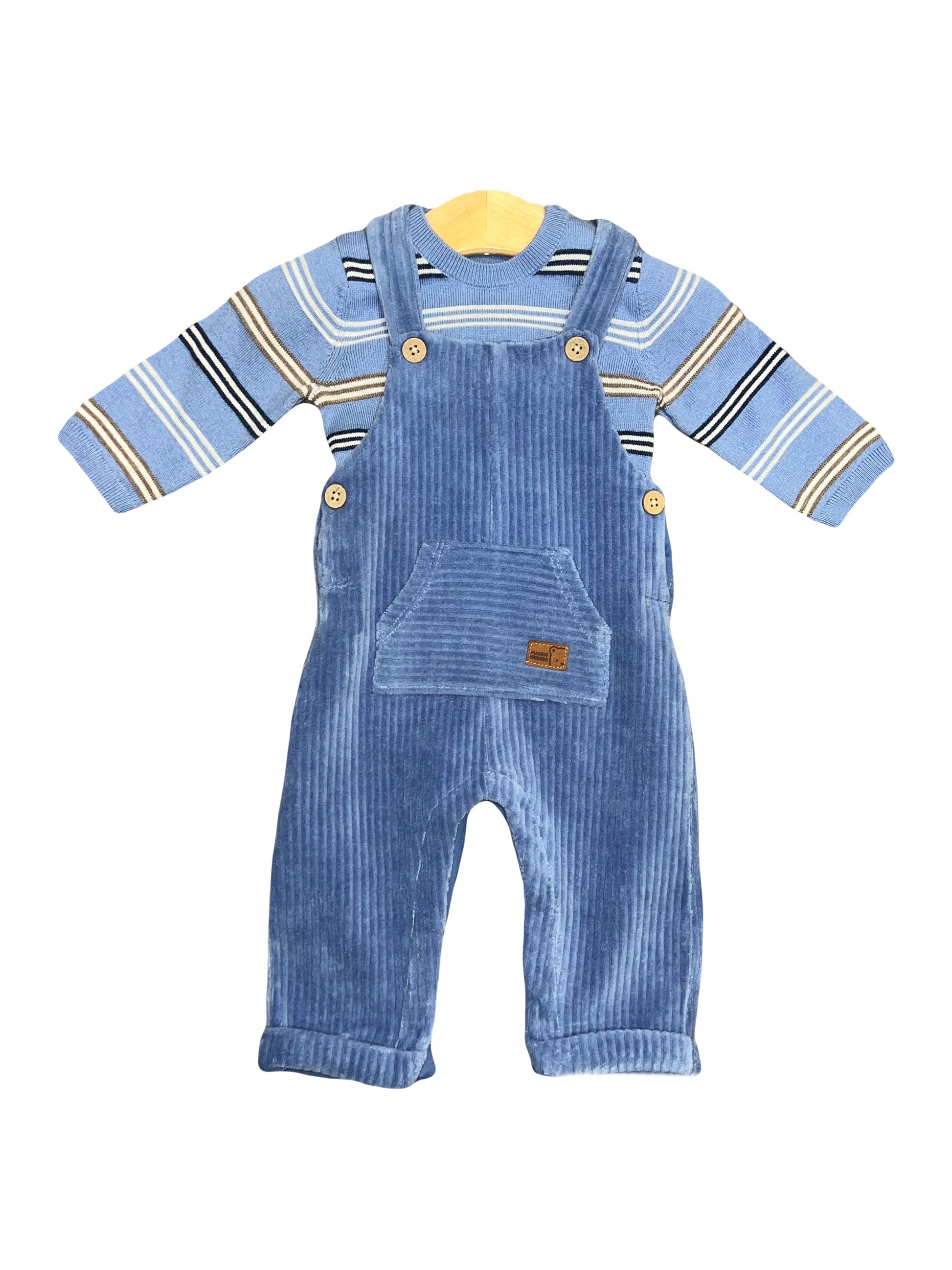 - Adorable 2-piece set featuring a striped knit blue top and matching soft blue overalls, perfect for your little boy.