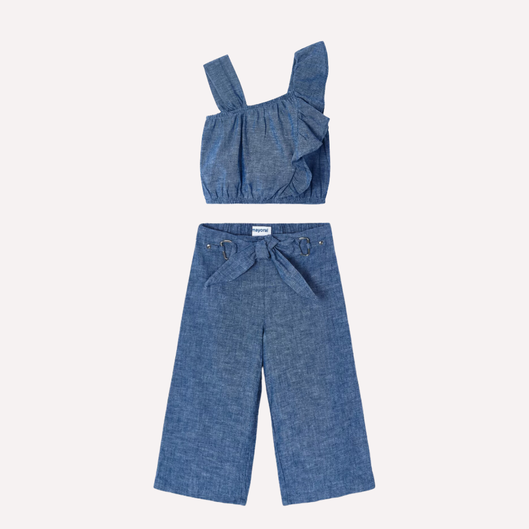 - Trendy 2pc Denim Top with One Side Ruffle and matching elastic waist Pant