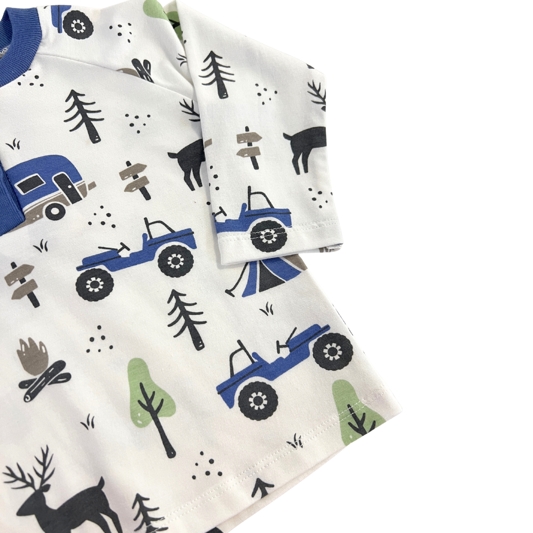 Let the adventures begin. This 3-piece set includes a cozy henley top featuring a playful camping print—complete with tents, moose, jeeps, and trees—paired with soft striped pants and a matching knit hat. Crafted from a breathable bamboo-cotton blend with a hint of stretch, it's perfect for everyday play or fireside cuddles.
