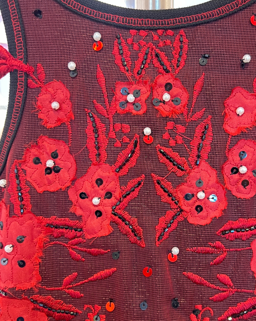• Bodice features intricate red floral embroidery adorned with pearls and sequins for a couture finish