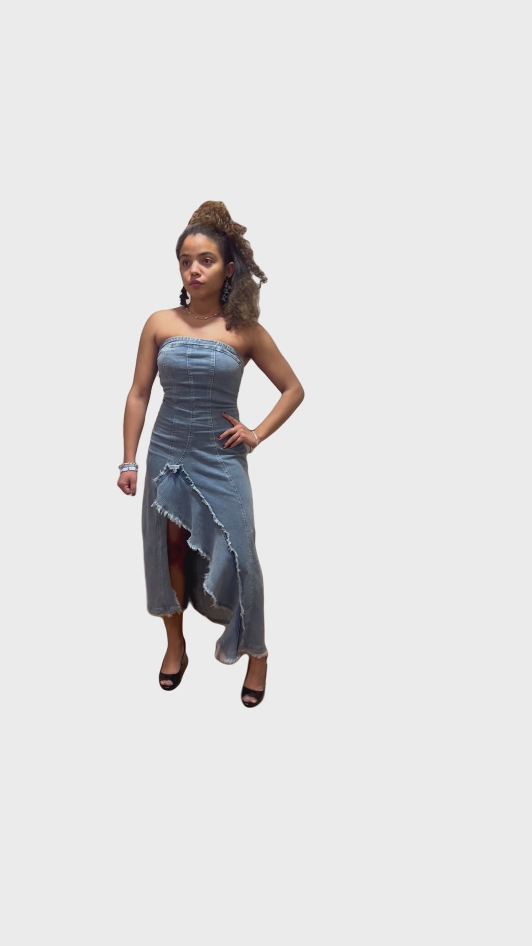 Elevate your style with our Ruffle Tube Strapless Denim Maxi Dress in medium denim. This dress features a stretch back with a zipper for a comfortable yet secure fit. The strapless design and ruffle detailing add a touch of sophistication, making it perfect for various occasions. Embrace the versatility of this denim maxi dress, ensuring both style and ease in one chic ensemble. Experience the epitome of fashion with this wardrobe essential, carefully crafted for the modern, confident woman.
