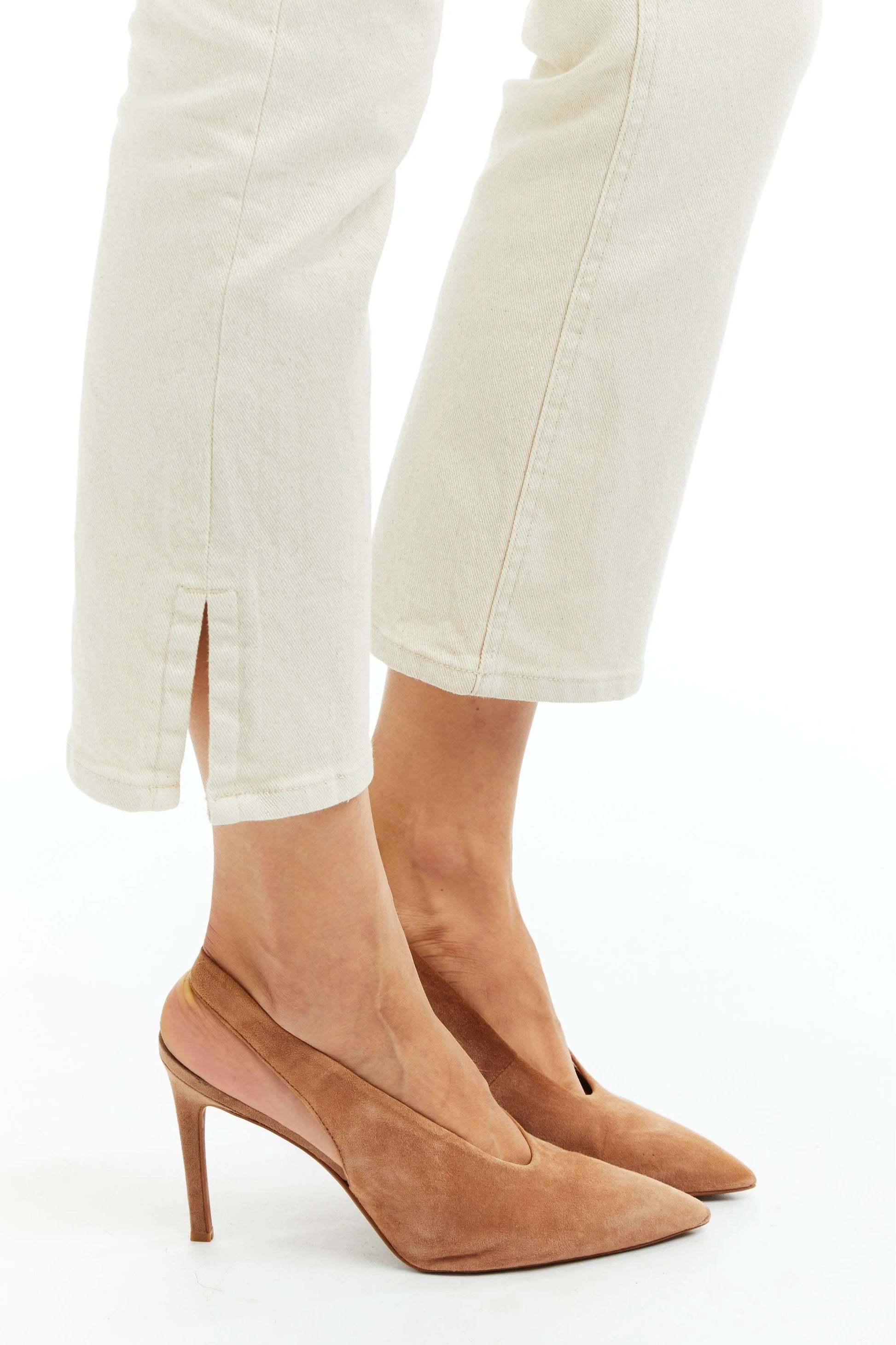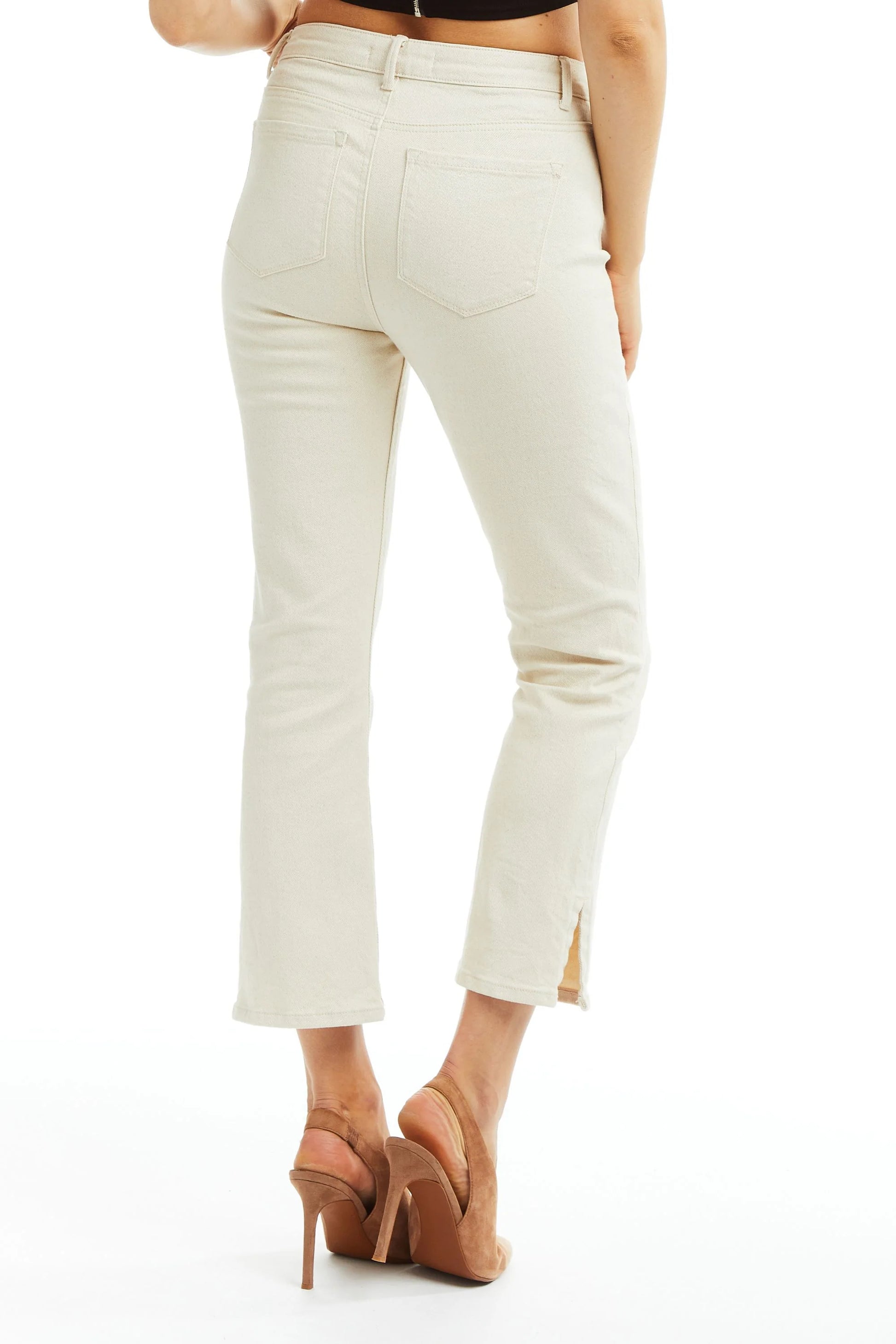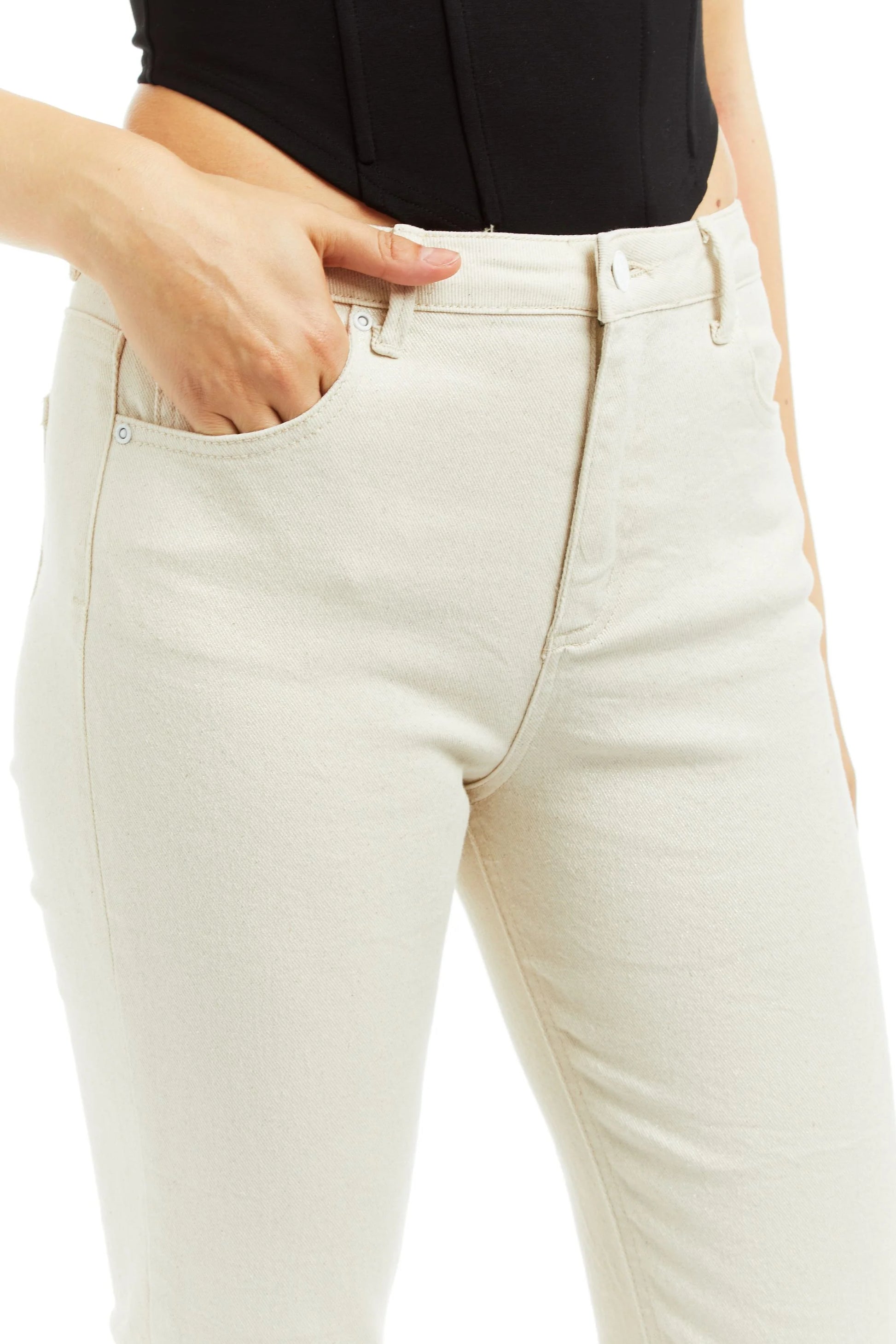 - Elegant cream high-rise flare jeans with side slits and clean hem, crafted from stretch lurex twill.