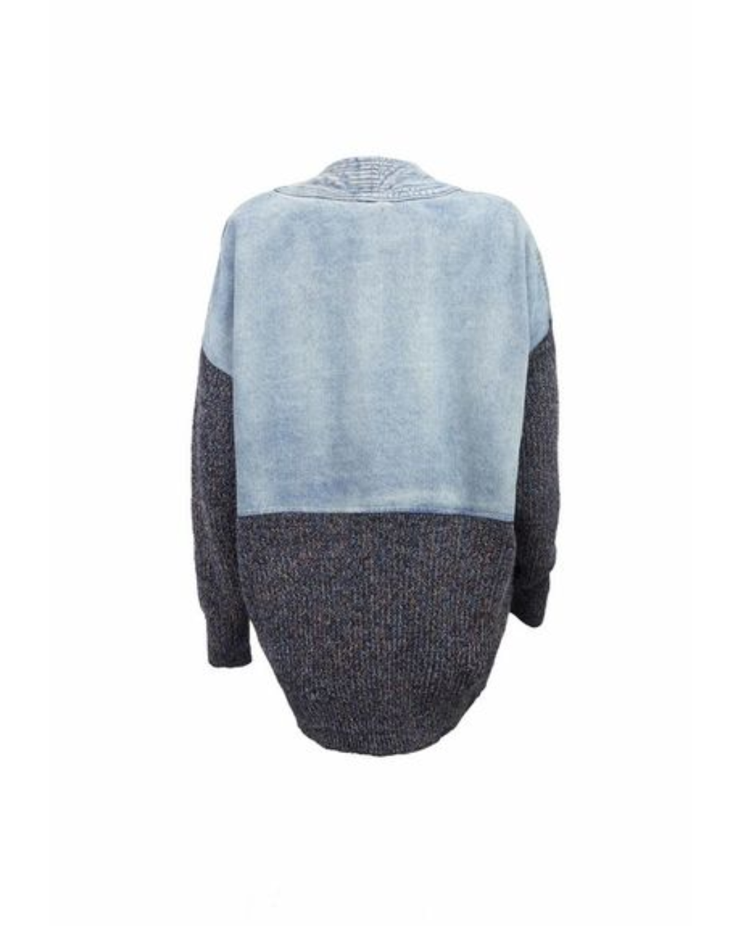 A modern mashup of rugged denim and cozy knit, this mixed-fabric jacket delivers a cool, laid-back vibe with elevated edge. Perfect for layering over basics or styling as your statement piece.