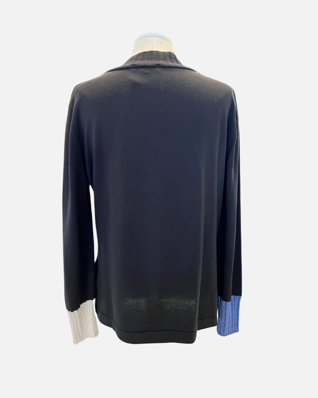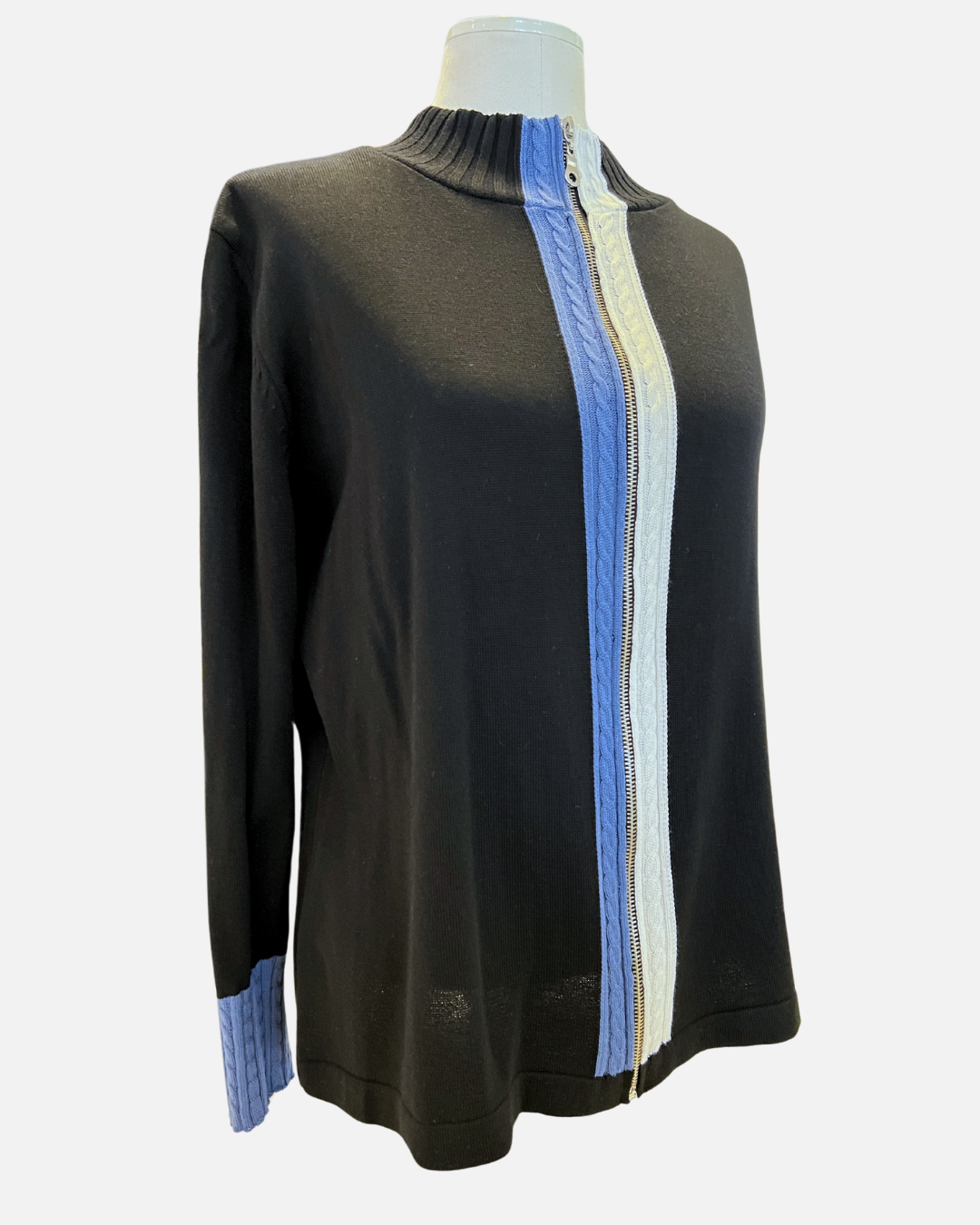 A cozy twist on a classic zip-up, this black denim-style sweater is elevated with braided knit detailing in blue and white for a fresh, color-blocked feel. The contrast cuffs give it a playful edge, making it perfect for weekend wear, travel days, or casual Fridays at the office.