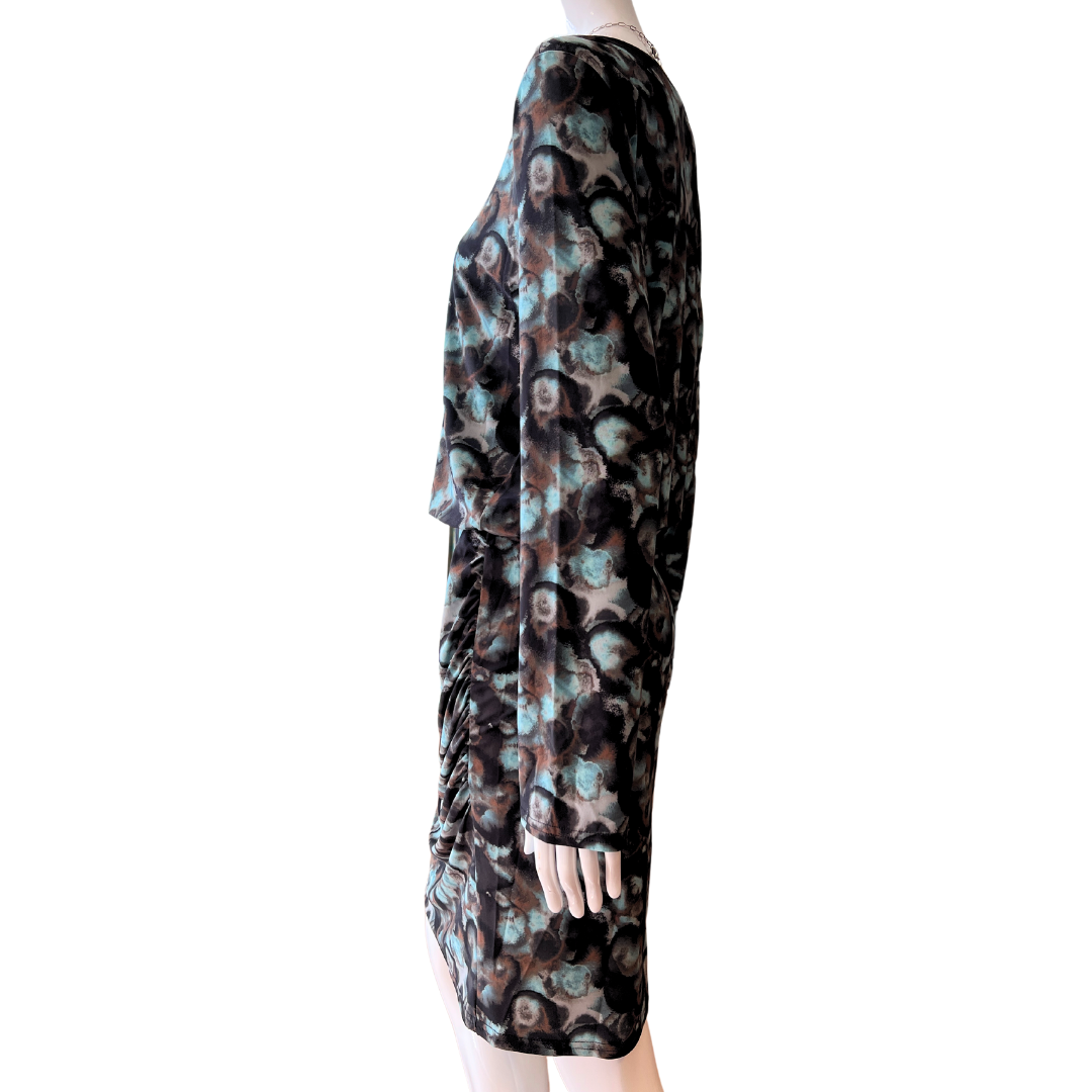Teal dress with abstract print and ruched sides for a stylish and flattering look.