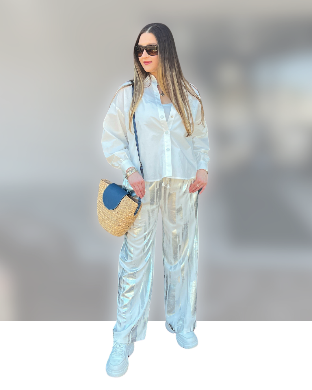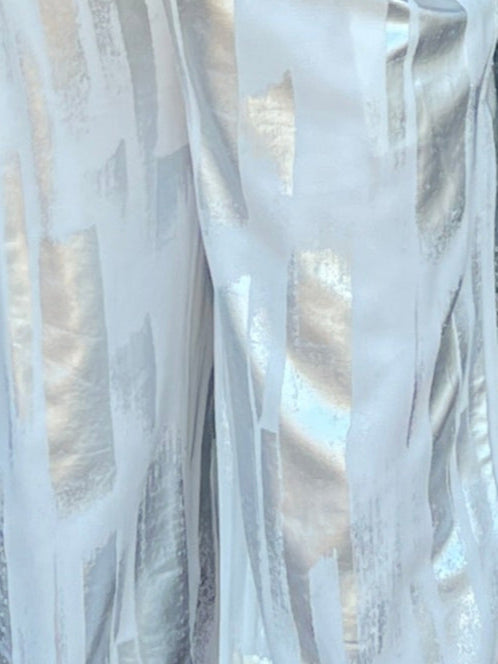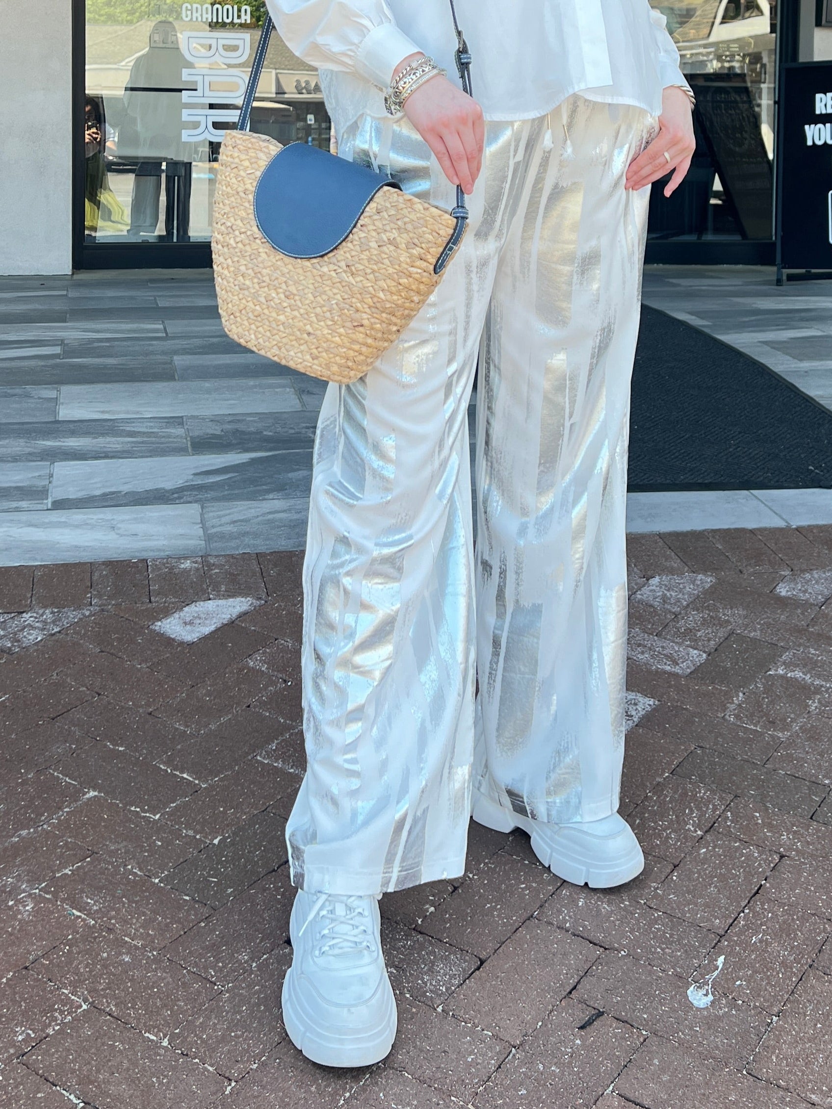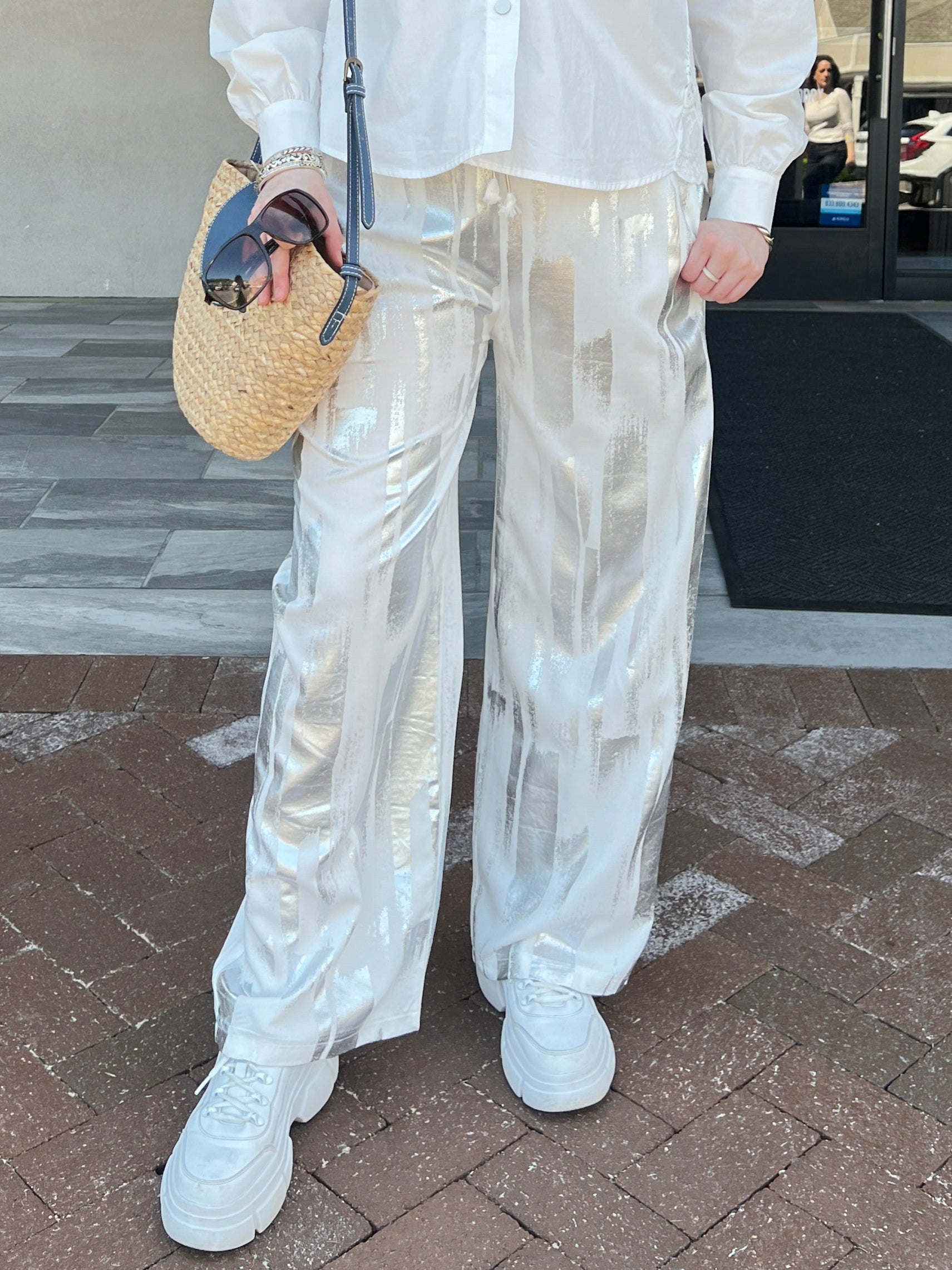 Shimmer in every step. These white pull-on pants feature a relaxed silhouette with a silver foil splash print for a bold, futuristic twist. Designed with comfort and edge in mind, they elevate your off-duty or night-out look instantly.